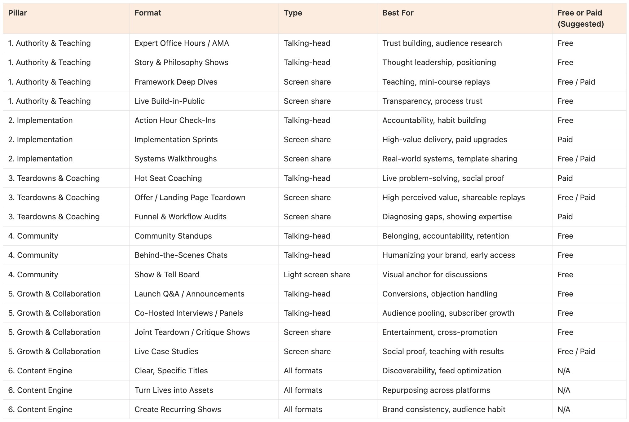 Mix it up. Use free sessions for authority and growth (AMAs, panels, behind-the-scenes). Reserve high-value implementation sprints and teardowns for paid subscribers. This creates a natural upgrade path.