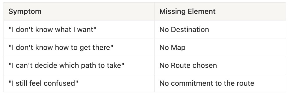 The real sequence is: choose a route → commit to it → clarity emerges.